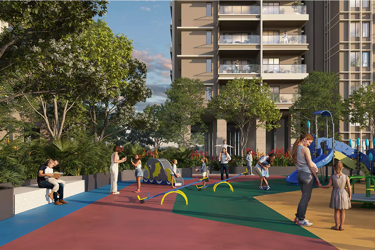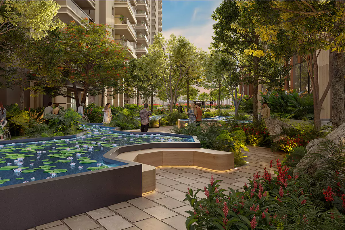 1.5 acres of landscaped bliss with amphitheatre, pools, and kids’ play zones.
