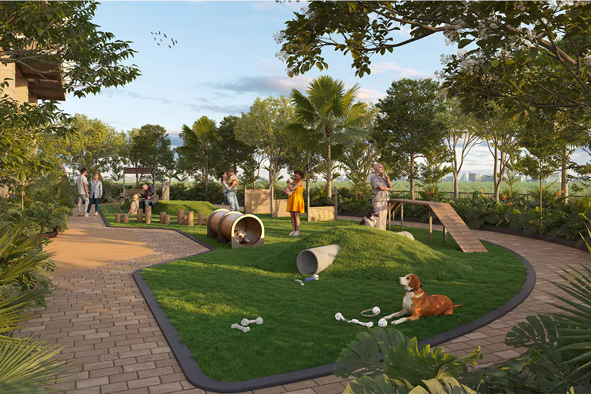Outdoor gym, yoga decks, reflexology paths, and senior fitness corners.